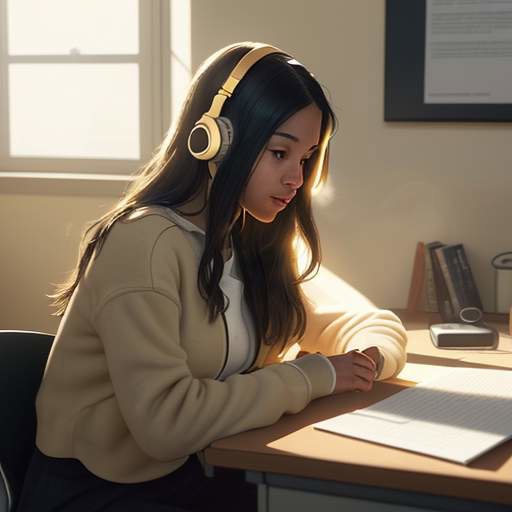 [IMAGE PROMPT: A photorealistic, cinematic depiction of a cozy study room bathed in soft, golden evening light. A diverse high school student sits comfortably at a sleek desk, wearing noise-canceling headphones. In front of them, a holographic AI tutor interface floats in mid-air, displaying floating mathematical equations and colorful graphs that shift dynamically. The student looks engaged and curious, pointing at a glowing data stream. The background features blurred bookshelves filled with physical and digital textbooks, symbolizing the blend of traditional and futuristic learning resources. High quality, sharp details, 16:9 aspect ratio, final image width 650px strict, no text in image, no watermark, optimized for Flux/SD3/SDXL]